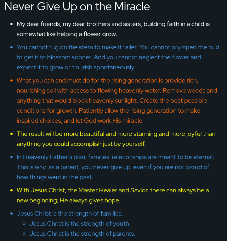In the talk, some text will be highlighted ORANGE. This means that the speaker is inviting us to act on the doctrine or principles of Jesus Christ’s Gospel.